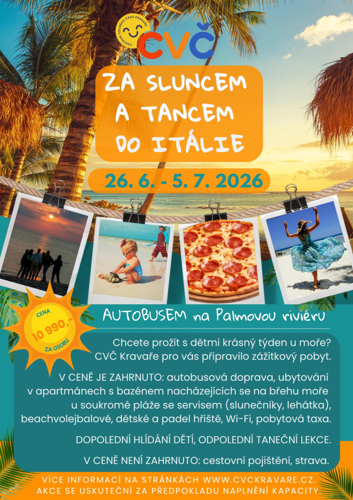 Zveme Vás na jedinečný zážitek u moře, který spojuje relax, pohyb, zábavu a také prostor jen pro sebe. CVČ Kravaře připravuje nezapomenutelný zájezd na Palmovou riviéru v oblasti Fermo, kde na vás čeká týden plný slunce, pohody a energie.